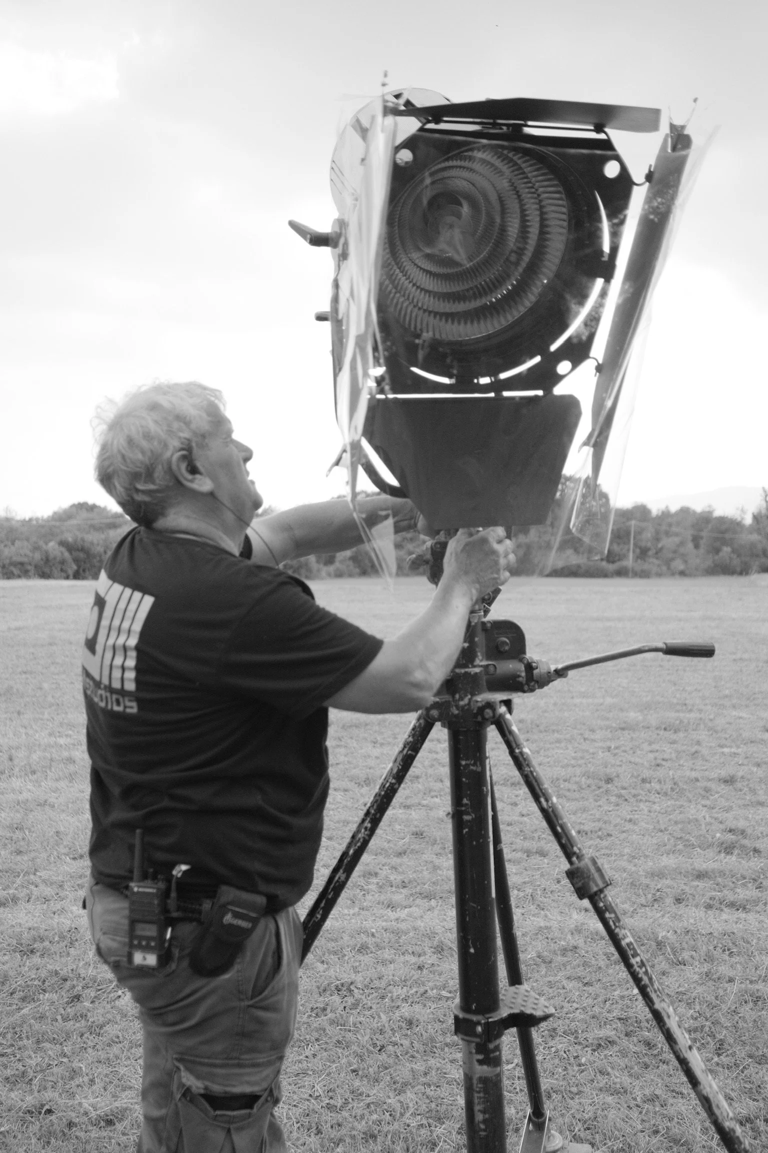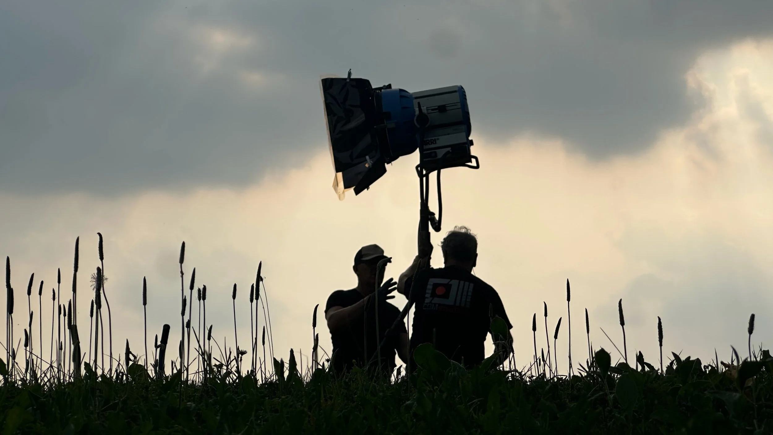 Two people silhouetted against a cloudy sky, working with a large filming or photography light on a grassy field.