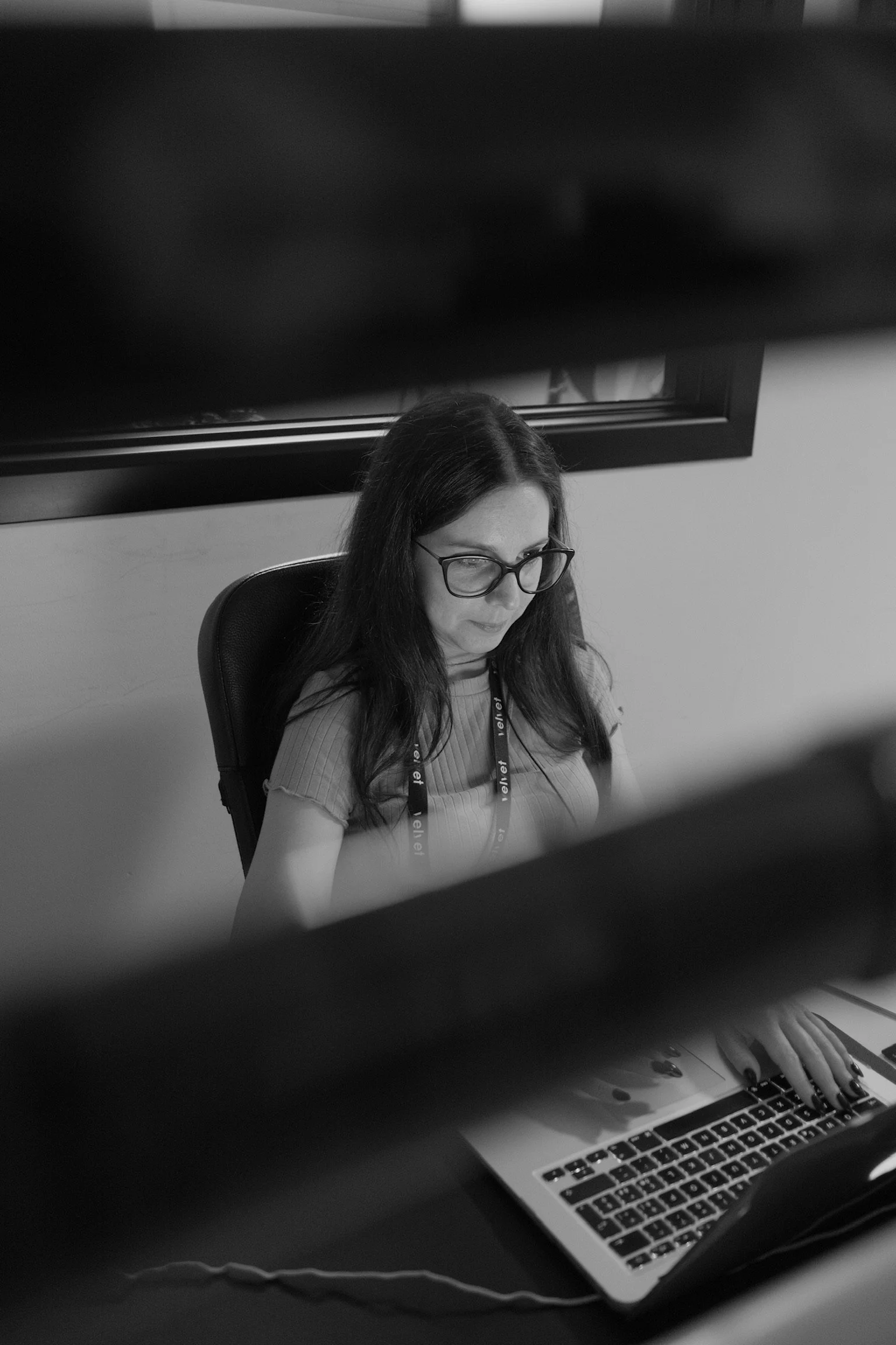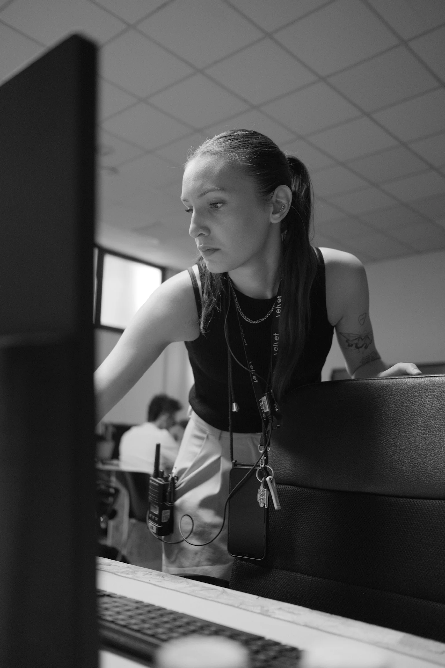 Black and white photo of a young woman with long dark hair in ponytail working at a desk, wearing a sleeveless top and a lanyard with keys, a phone, and an ID badges hanging from it, in a modern office setting.