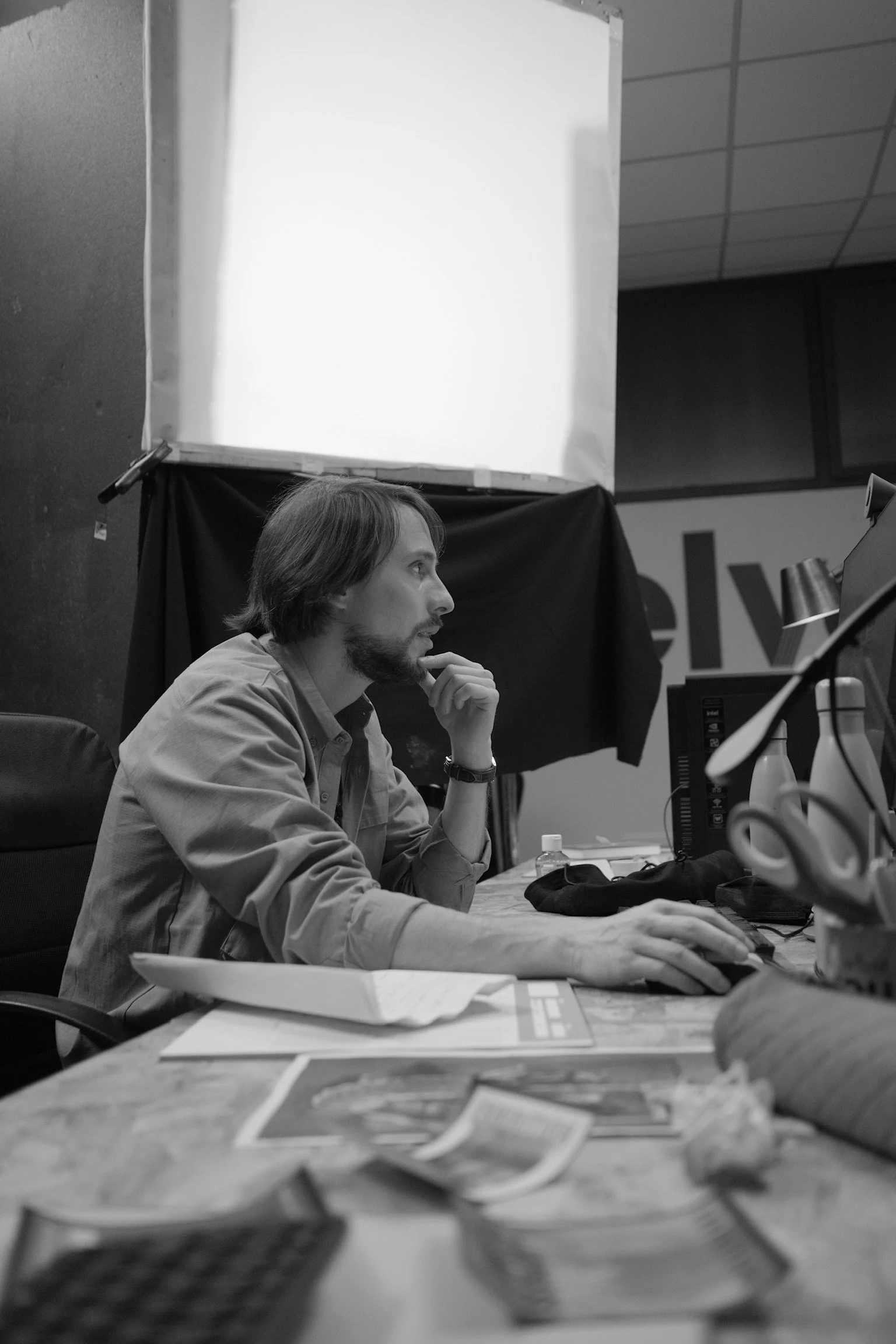 A man with shoulder-length hair and a beard sits at a desk, working on a computer, with his hand near his chin, in a black-and-white photo.