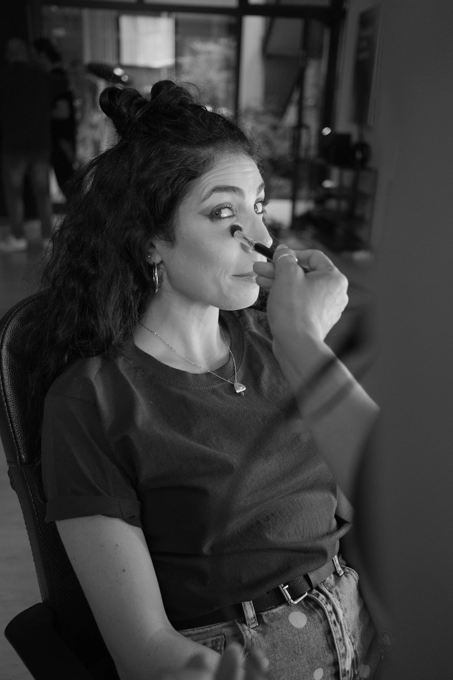 A woman with dark curly hair sitting in a chair gets her makeup done by an artist applying eye makeup with a brush.