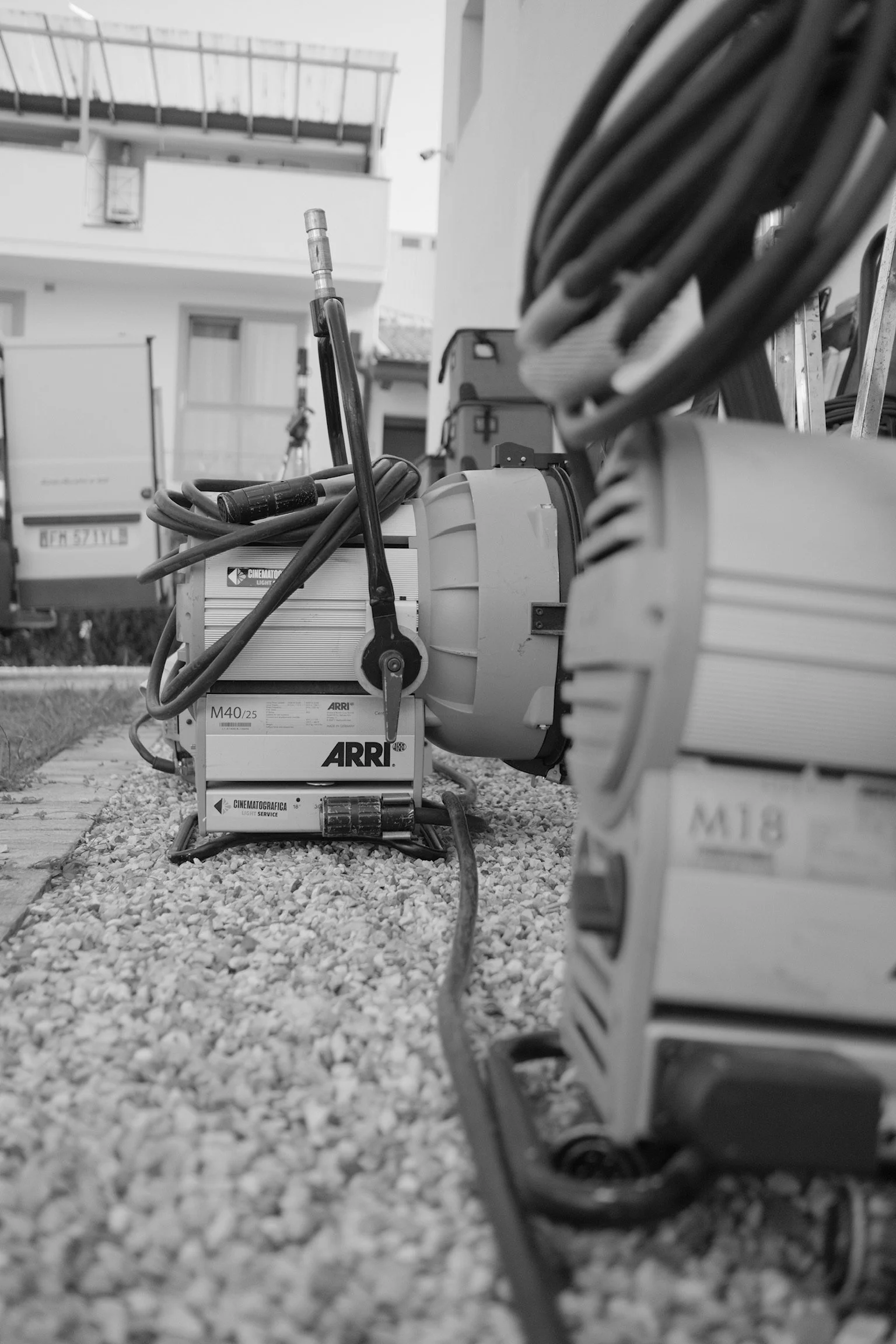 Close-up of film lighting equipment, including a film light, power cables, and control boxes, set up outdoors on a gravel surface with residential buildings in the background.