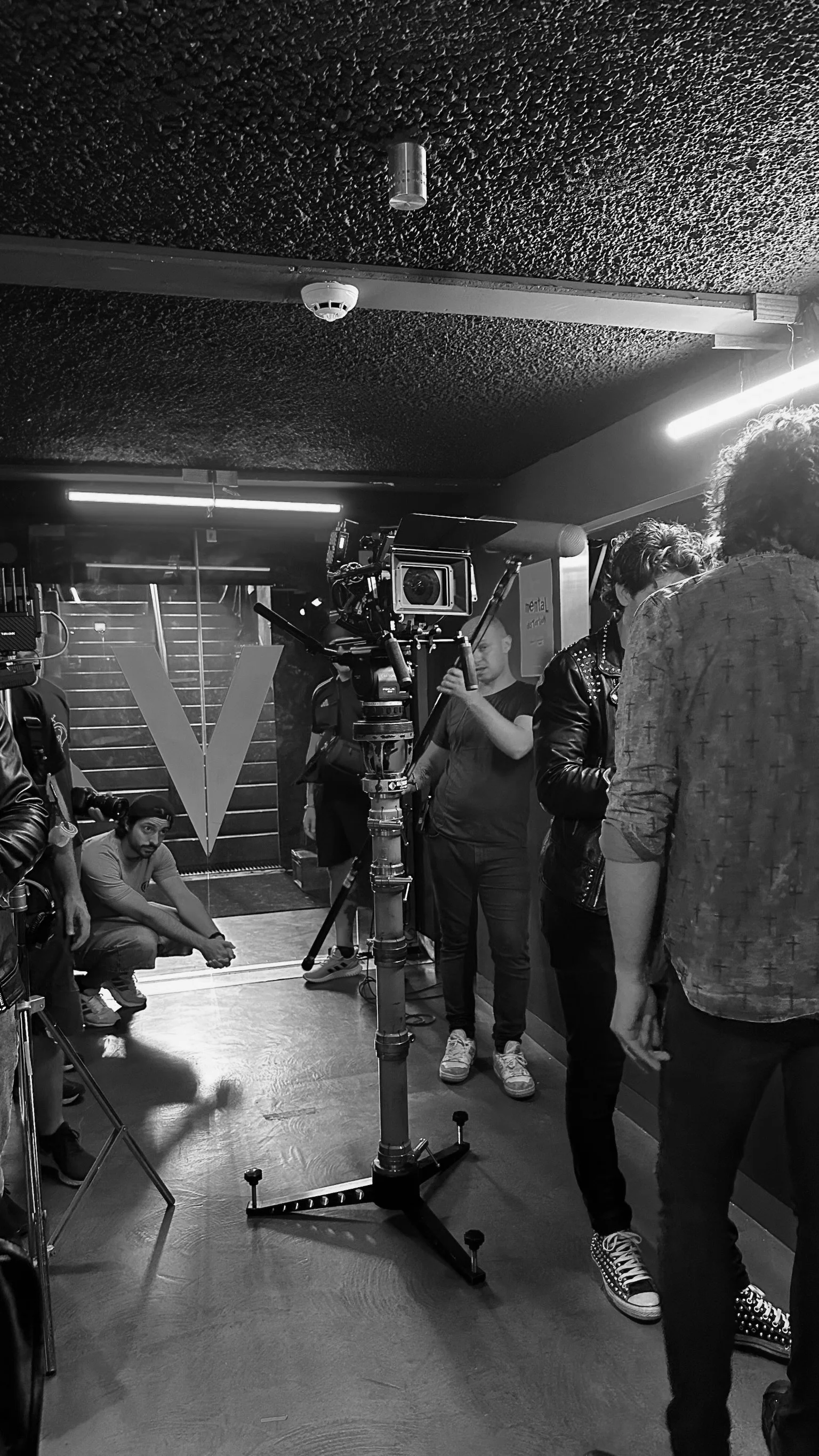 Black and white photo of a film set with a camera on a tripod, crew members preparing, and a large letter 'V' on the wall in the background.