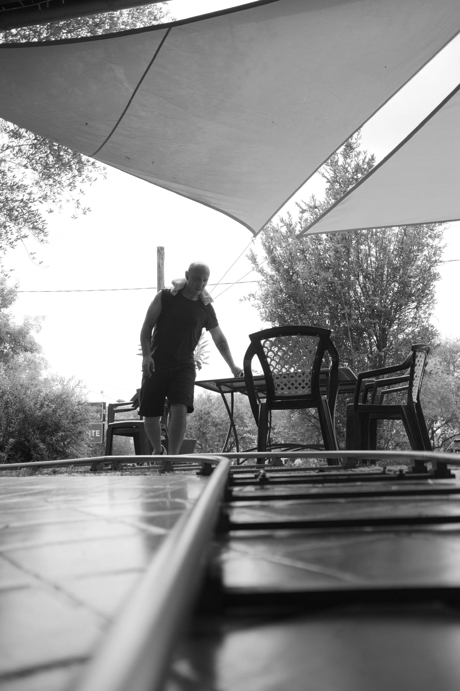 A black and white photo taken from a low angle showing a person outdoors under large umbrellas, with patio furniture and trees in the background.