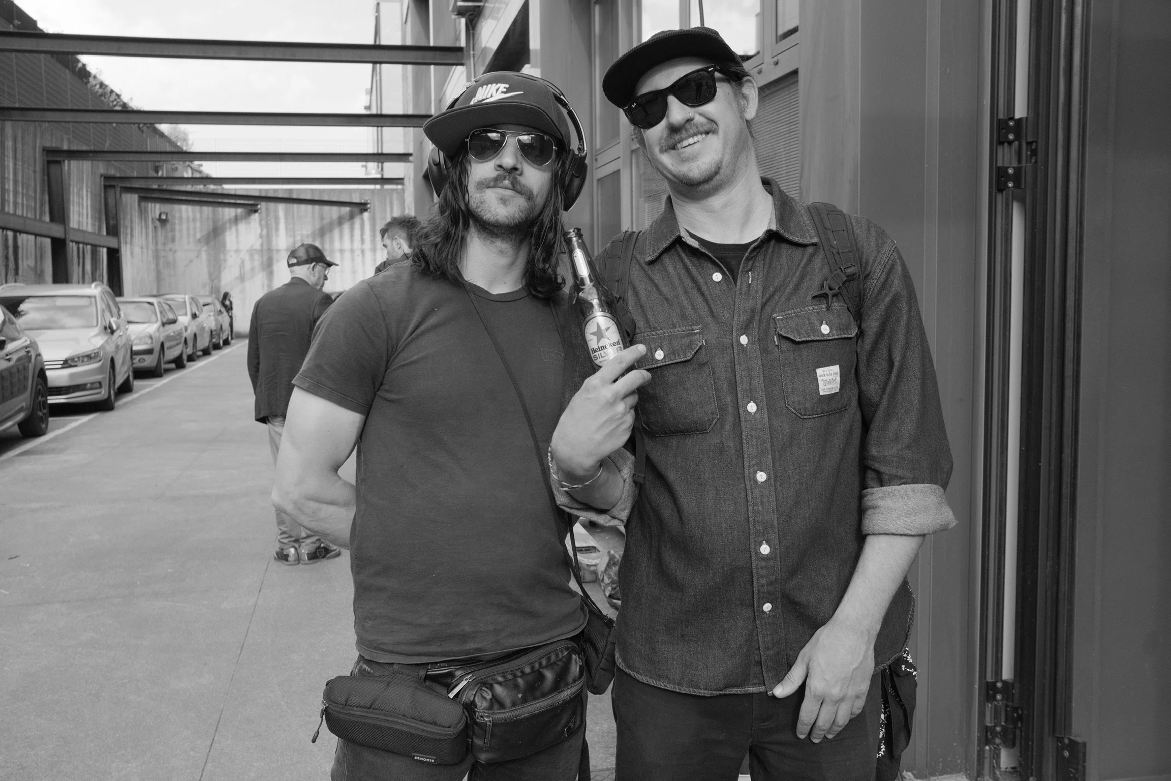 Two men standing side by side outdoors, wearing sunglasses and casual clothing, with one holding a bottle and making a peace sign. Several cars are parked behind them.